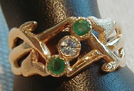 Bague en or jaune, émeraude et diamant, réalisée par la technique de fonte à cire perdue |